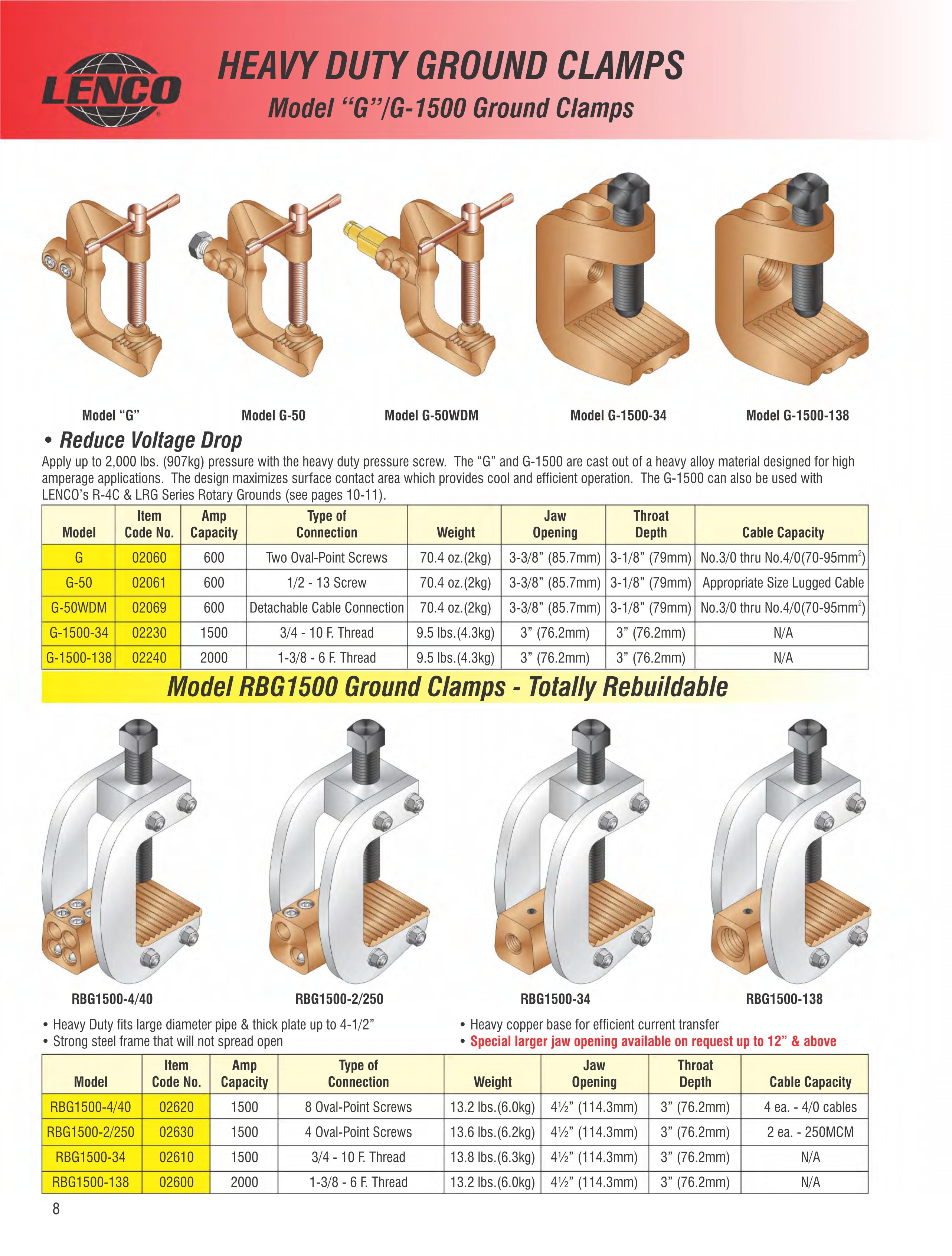 | Модель | Артикул | Амперы | Тип соединения кабеля | Тип резьбы (дюймы) | Вес | Открытие | Глубина зажима |